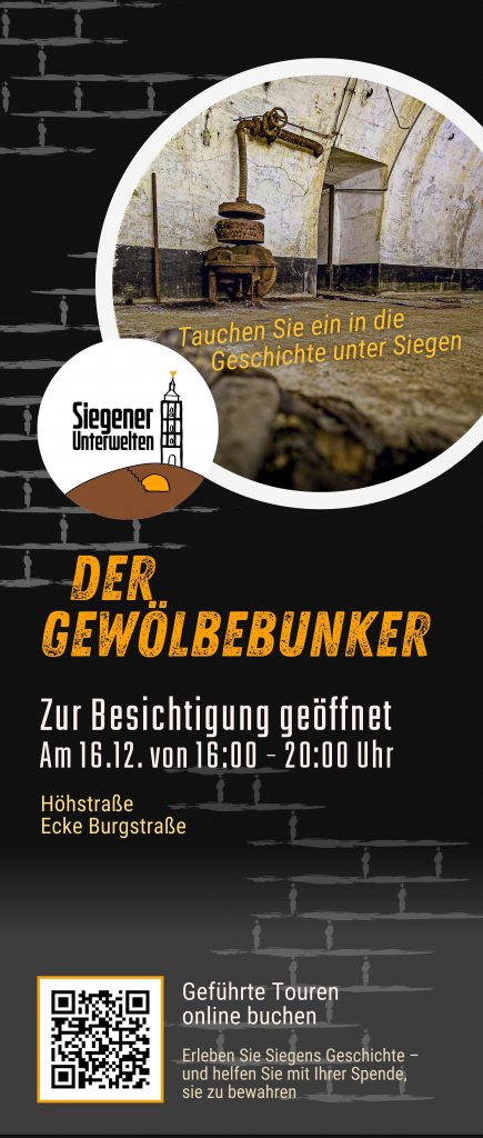 Am 16. Dezember öffnen die Siegener Unterwelten den historischen Gewölbebunker in der Burgstraße. Das Datum wurde bewusst gewählt: Genau an diesem Tag, im Jahr 1944, traf der schwerste Bombenangriff die Stadt Siegen und verwüstete große Teile der Altstadt. Der Tag des offenen Gewölbebunkers lädt dazu ein, diesen Teil der Stadtgeschichte unmittelbar vor Ort nachzuvollziehen.